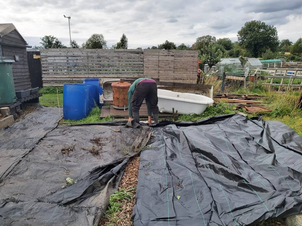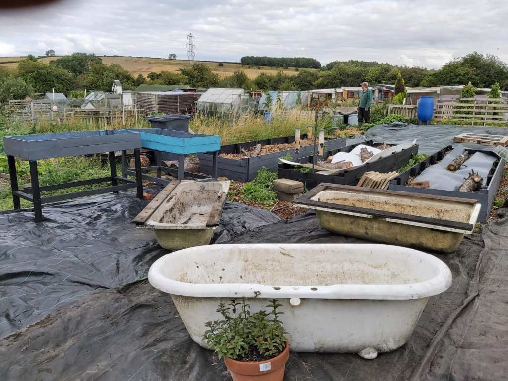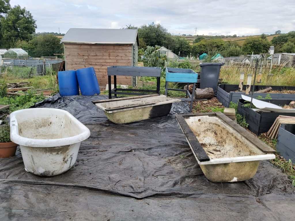 Raised beds are great for contaminated soil area’s , In our case 3 baths & 2 raised beds the floor is covered in membrane a weed control fabric which is used for suppressing weed growth then layer bark chippings from our local tree surgeon.