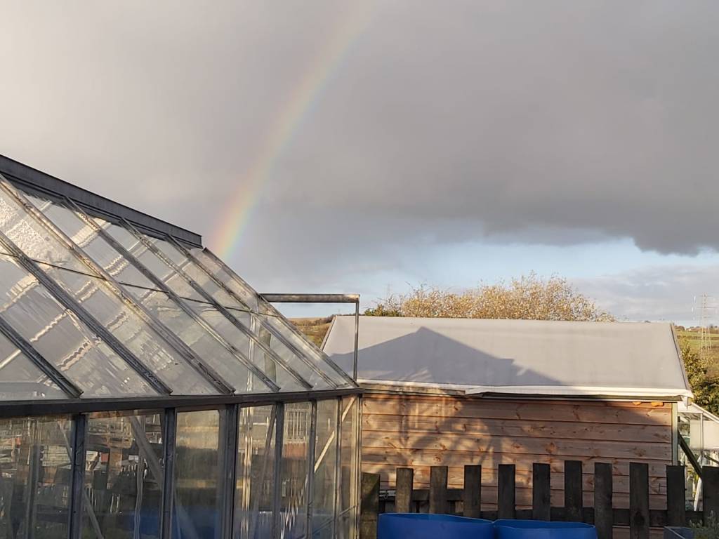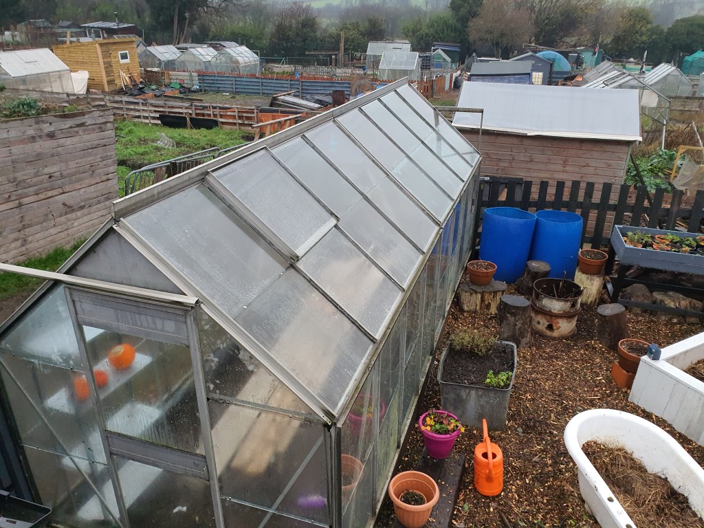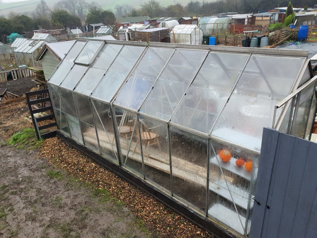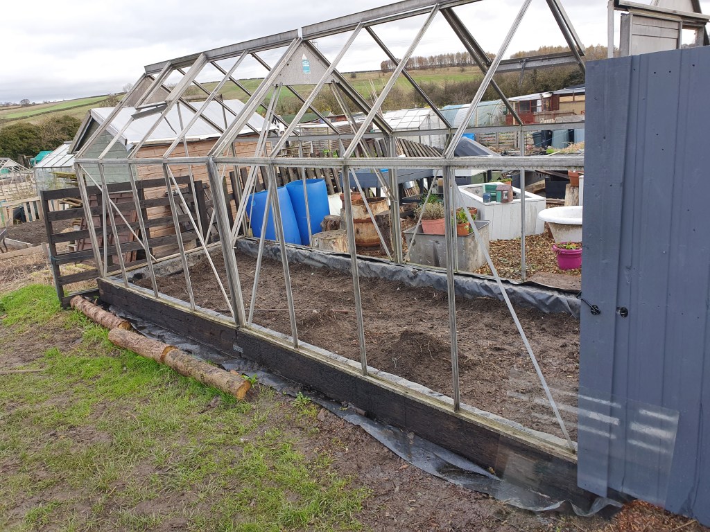 Finally after illness & the terrible weather we have been having the greenhouse is built & looking good.