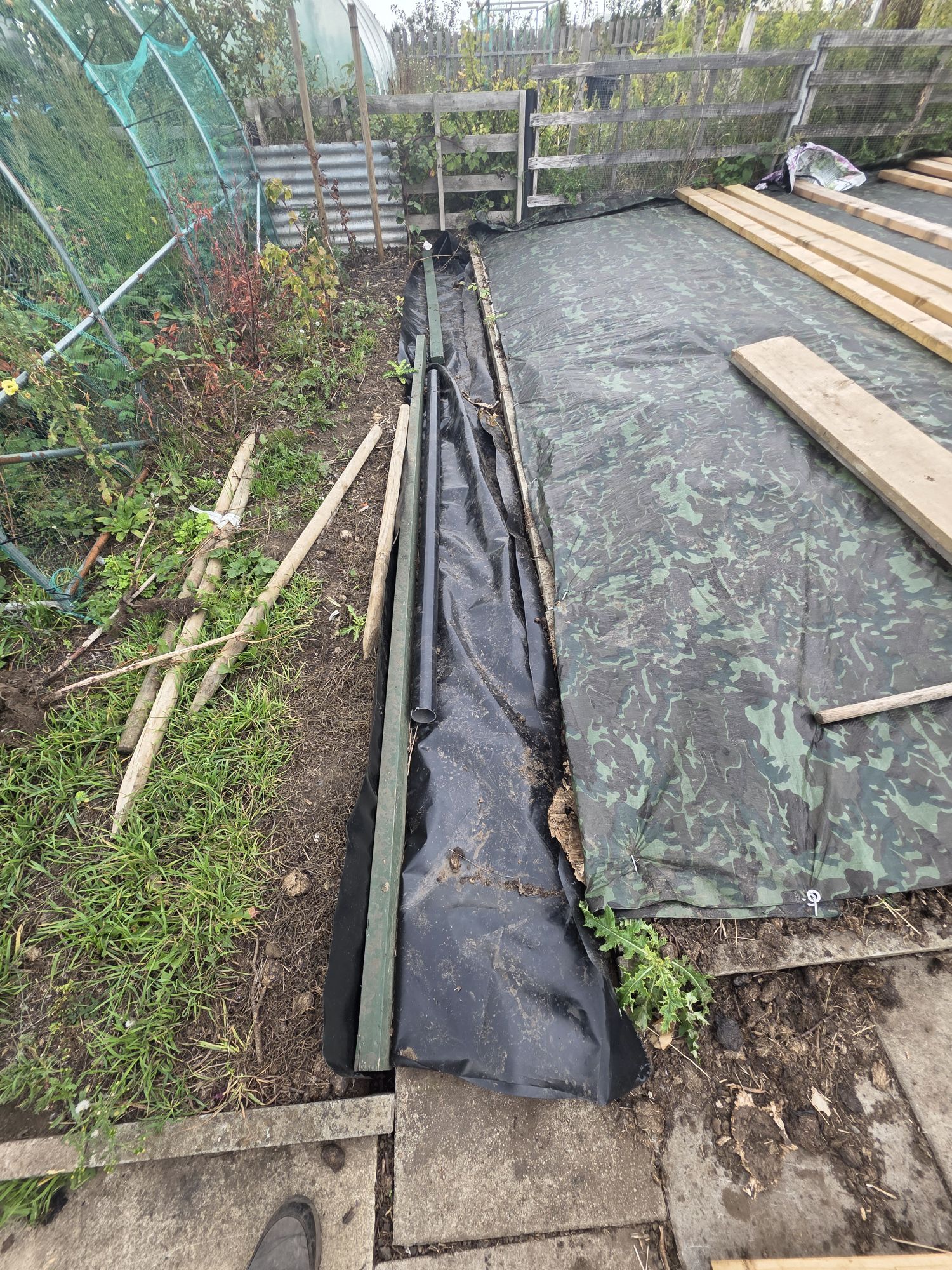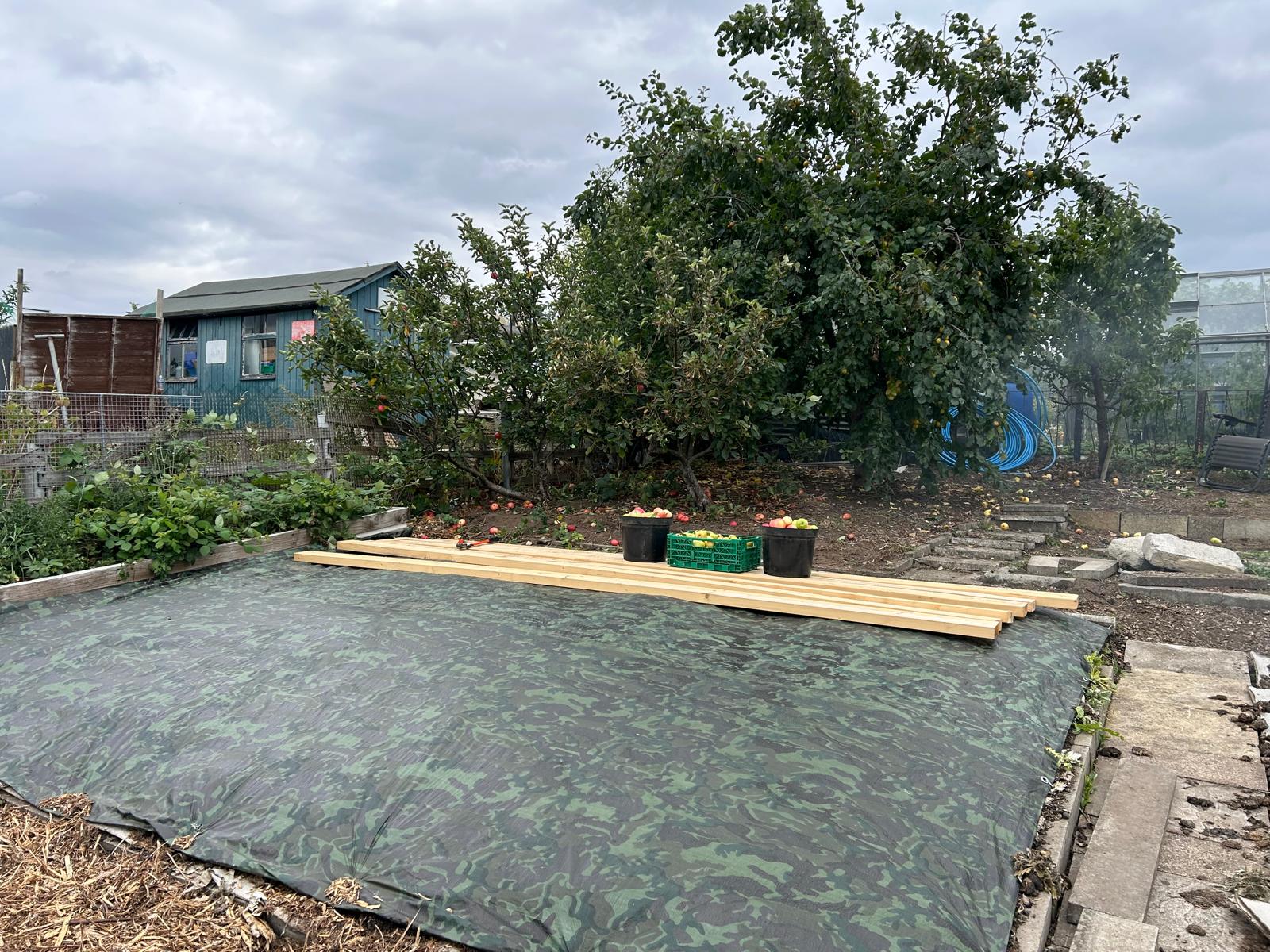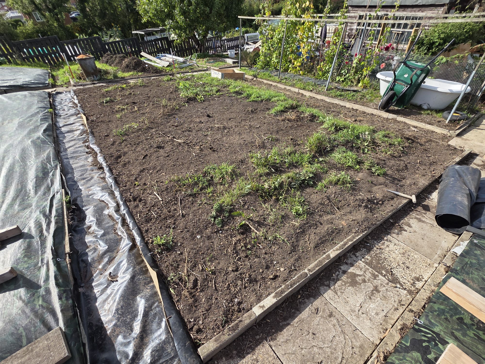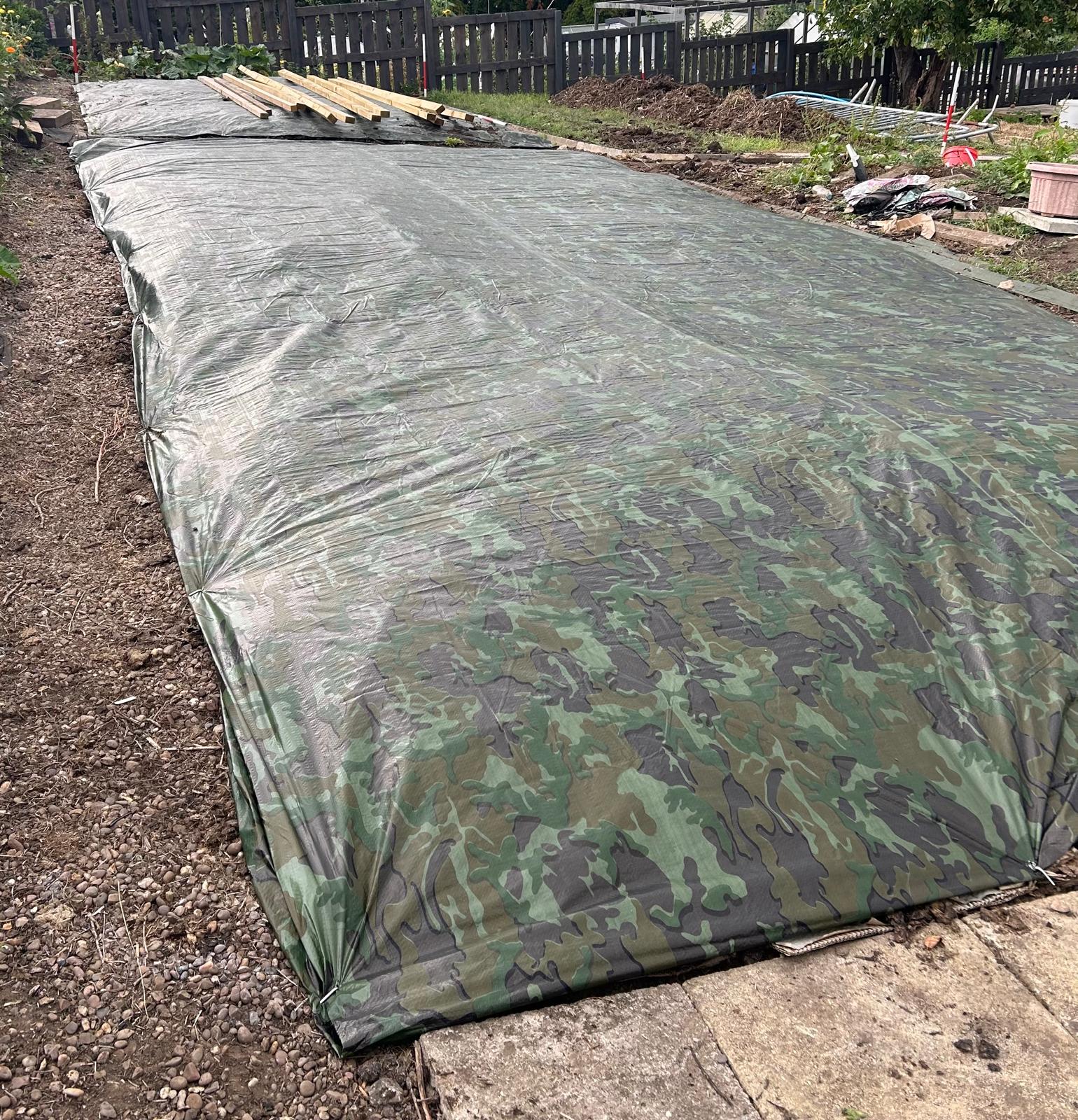 - Then, like us we covered the bed with a tarpaulin & make sure you peg it down. Which make sure no light can penetrate down into the soil.