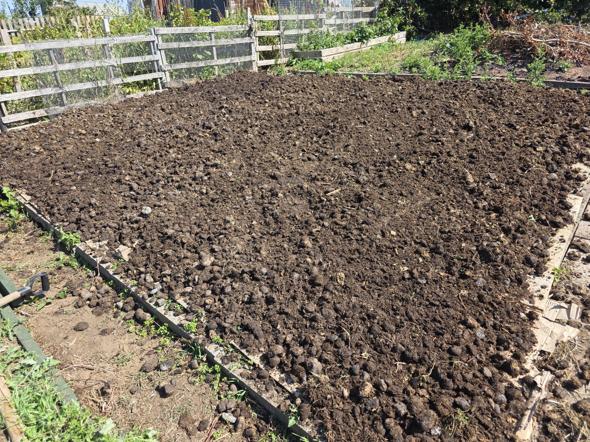 - Add a 15-20cm thick layer of mulch. We used well-rotted manure, but you could use leaves, straw, grass cuttings – or a mix of them all.