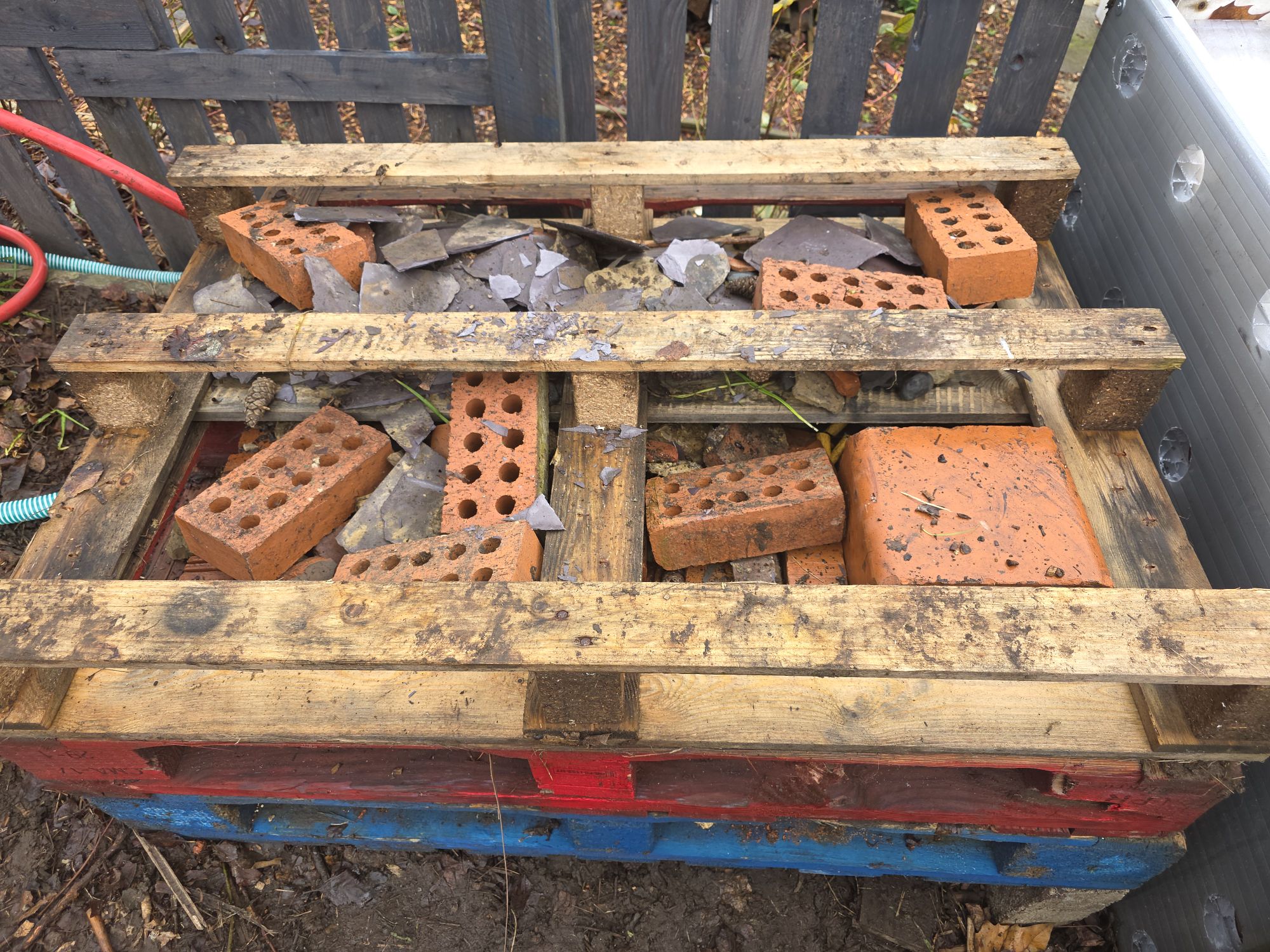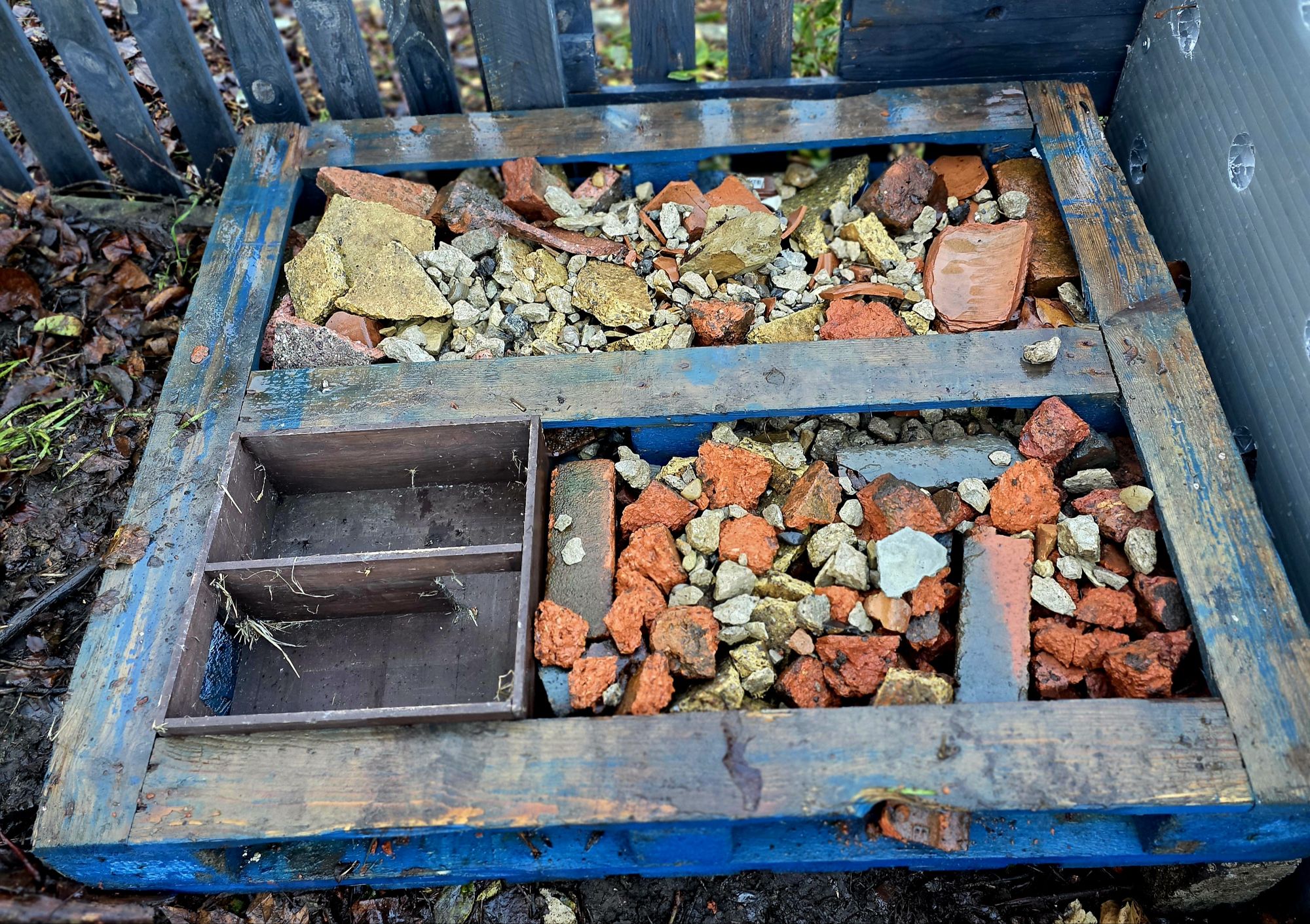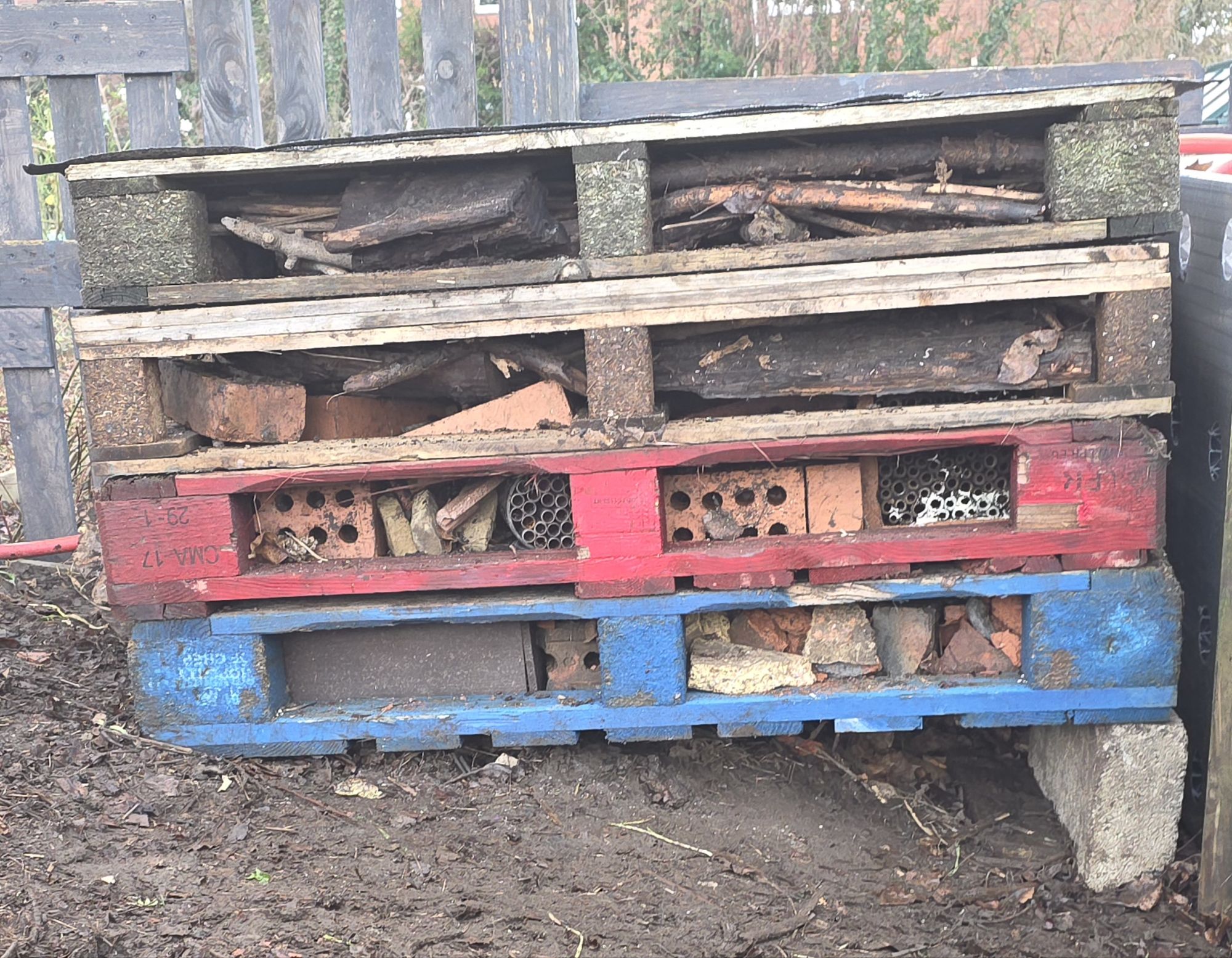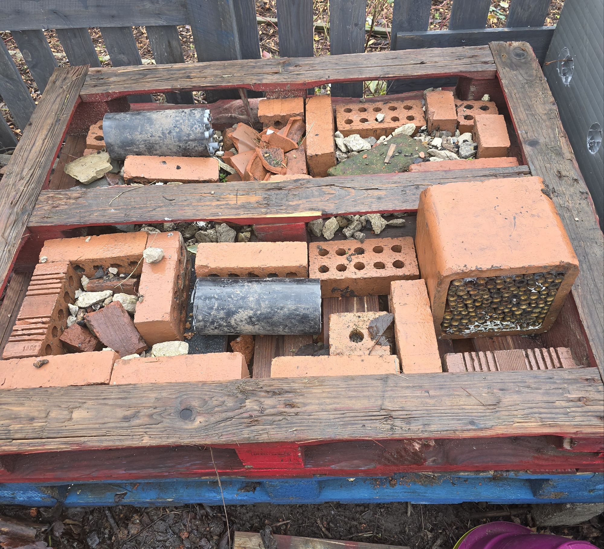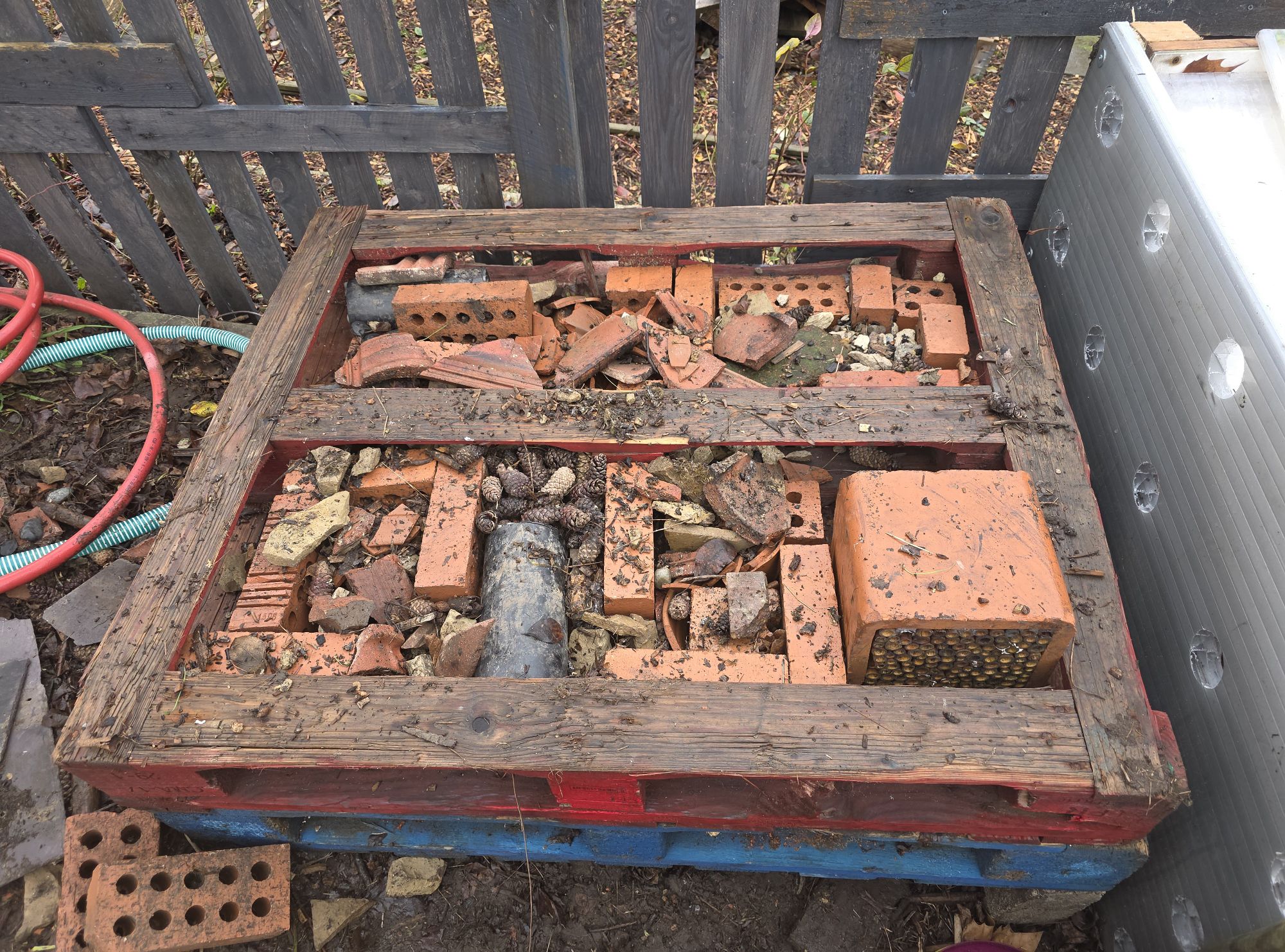 Old wooden pallets are perfect for a large hotel as they’re sturdy and come with ready-made gaps. Start by laying some bricks on the ground as sturdy corners. Leave some spaces in between the bricks. Add three or four layers of wooden pallets on top of your bricks. In our case we have a ground floor apartment to attract hedgehogs.
